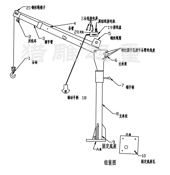 5、 把小吊機上的接線盒(19)接好;